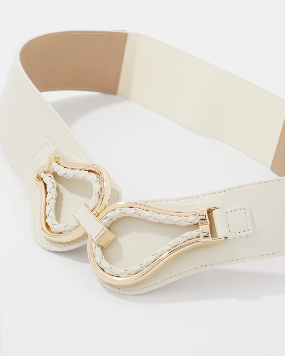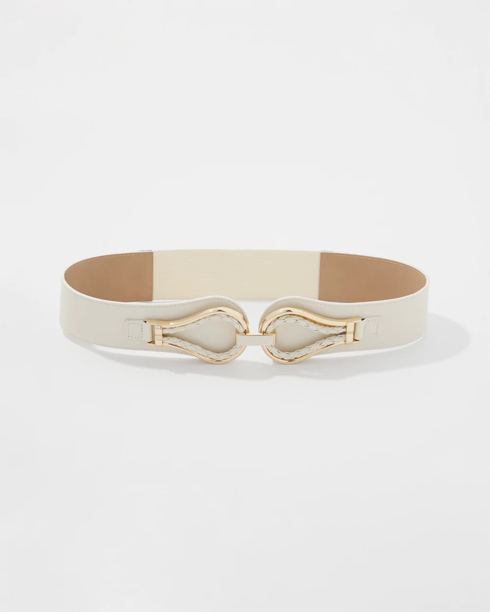 This wide stretch waist belt is a simple style update for dresses and longer tops or shirts. Designed with braided faux leather and gold hardware details that come together in a front hook closure.