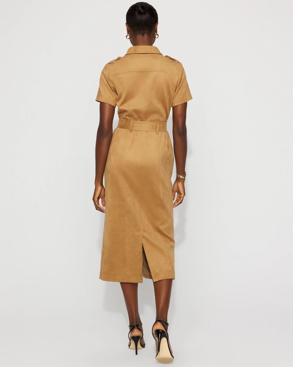 This timeless shirt dress is made from soft, luxe faux suede with plenty of stretch. Designed with functional patch pockets and self-covered buttons, it has a removable belt with a self-covered buckle. Shoulder epaulets finish the look of this polished dress.