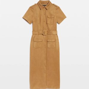This timeless shirt dress is made from soft, luxe faux suede with plenty of stretch. Designed with functional patch pockets and self-covered buttons, it has a removable belt with a self-covered buckle. Shoulder epaulets finish the look of this polished dress.