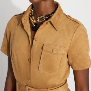 This timeless shirt dress is made from soft, luxe faux suede with plenty of stretch. Designed with functional patch pockets and self-covered buttons, it has a removable belt with a self-covered buckle. Shoulder epaulets finish the look of this polished dress.