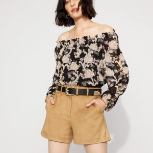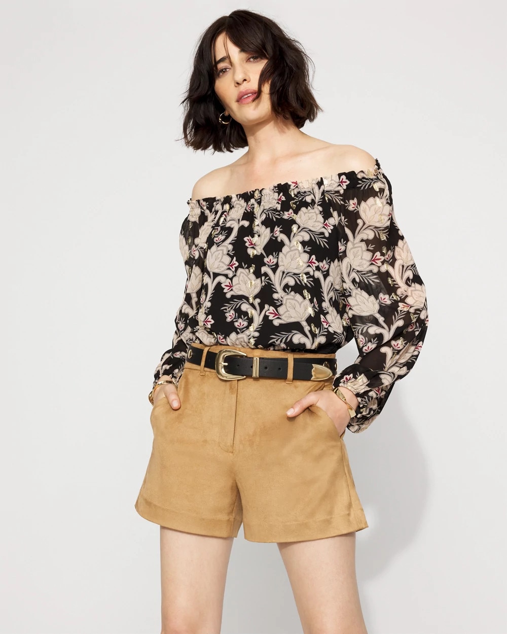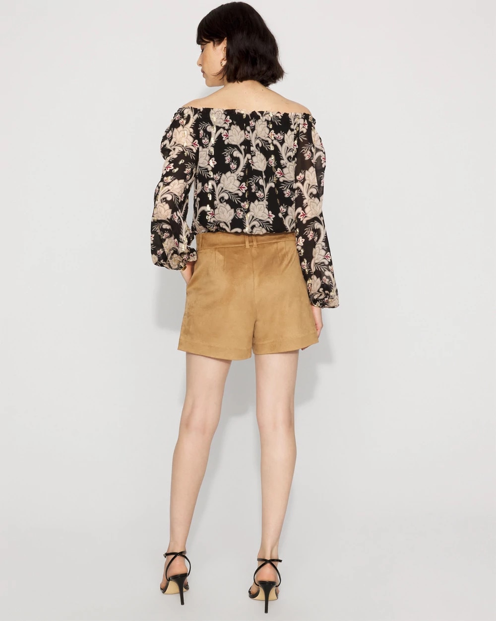 We love the luxe texture of these faux suede shorts, designed with slash pockets and a high-rise. Wear with your favorite tee or blouse or go for a complete look and wear them with our Faux Suede Moto Jacket and boots.