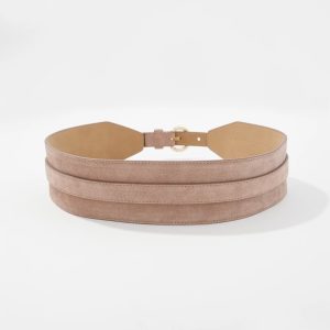 This wide waist belt closes in front with a round silver buckle. Made from faux suede in a taupe hue, this belt is a refined and luxe addition to your wardrobe. For a coordinated look, pair it with our matching Capped Toe Slingback.
