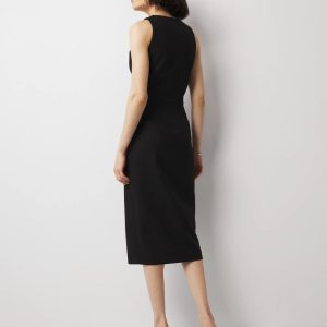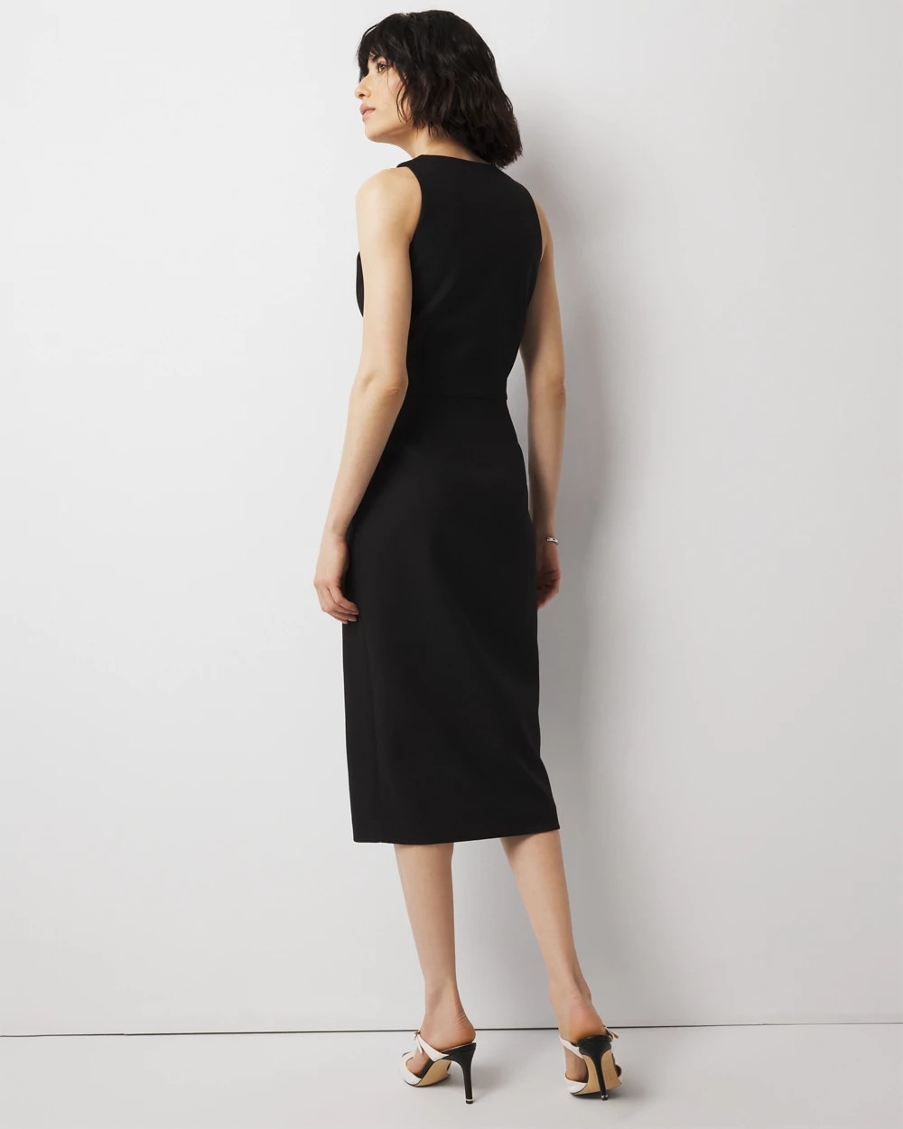 Meet your new favorite office dress, we’ve designed this wrap inspired sheath with a functioning cross front belt with buckle and grommet closure. There is a slight slit in front as well as back dart details and princess seams.