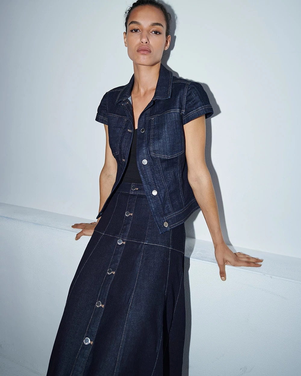 Not your average jean jacket, this flirty denim topper has fluttery cap sleeves, soft gold buttons and an elevated dark rinse with contrast stitching. Great to wear over a tee, but we love this with dresses too.