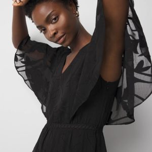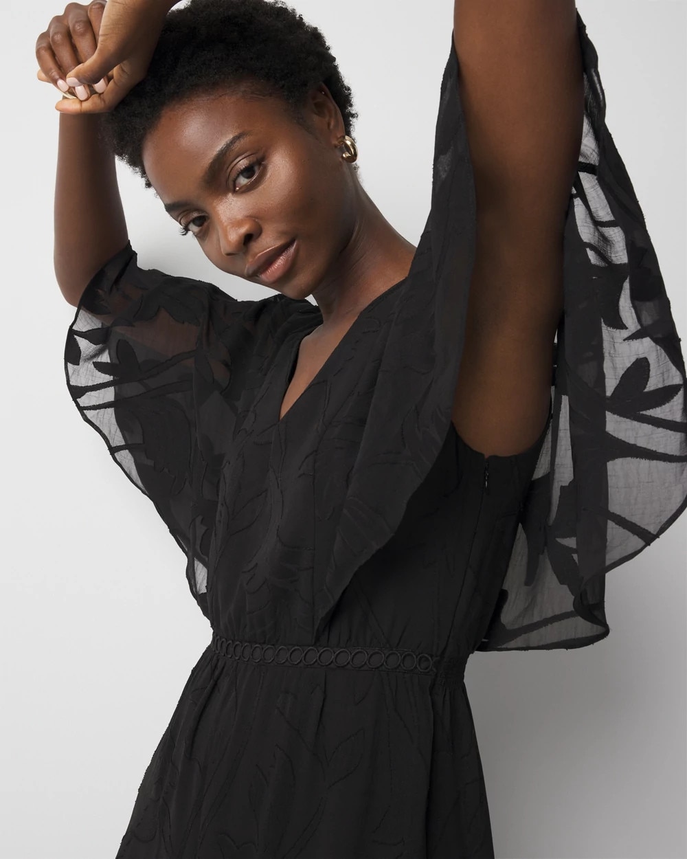 This flirty dress has a flounce sleeve design that nods to the current cape trend, and a flounce hem. The floral burnout pattern and ladder trim are details that elevate the look, while the smocked waist makes for easy pullover wear. Wear with strappy heels or sandals.