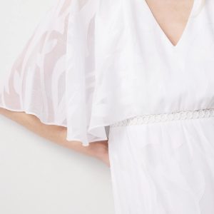 This flirty dress has a flounce sleeve design that nods to the current cape trend, and a flounce hem. The floral burnout pattern and ladder trim are details that elevate the look, while the smocked waist makes for easy pullover wear. Wear with strappy heels or sandals.