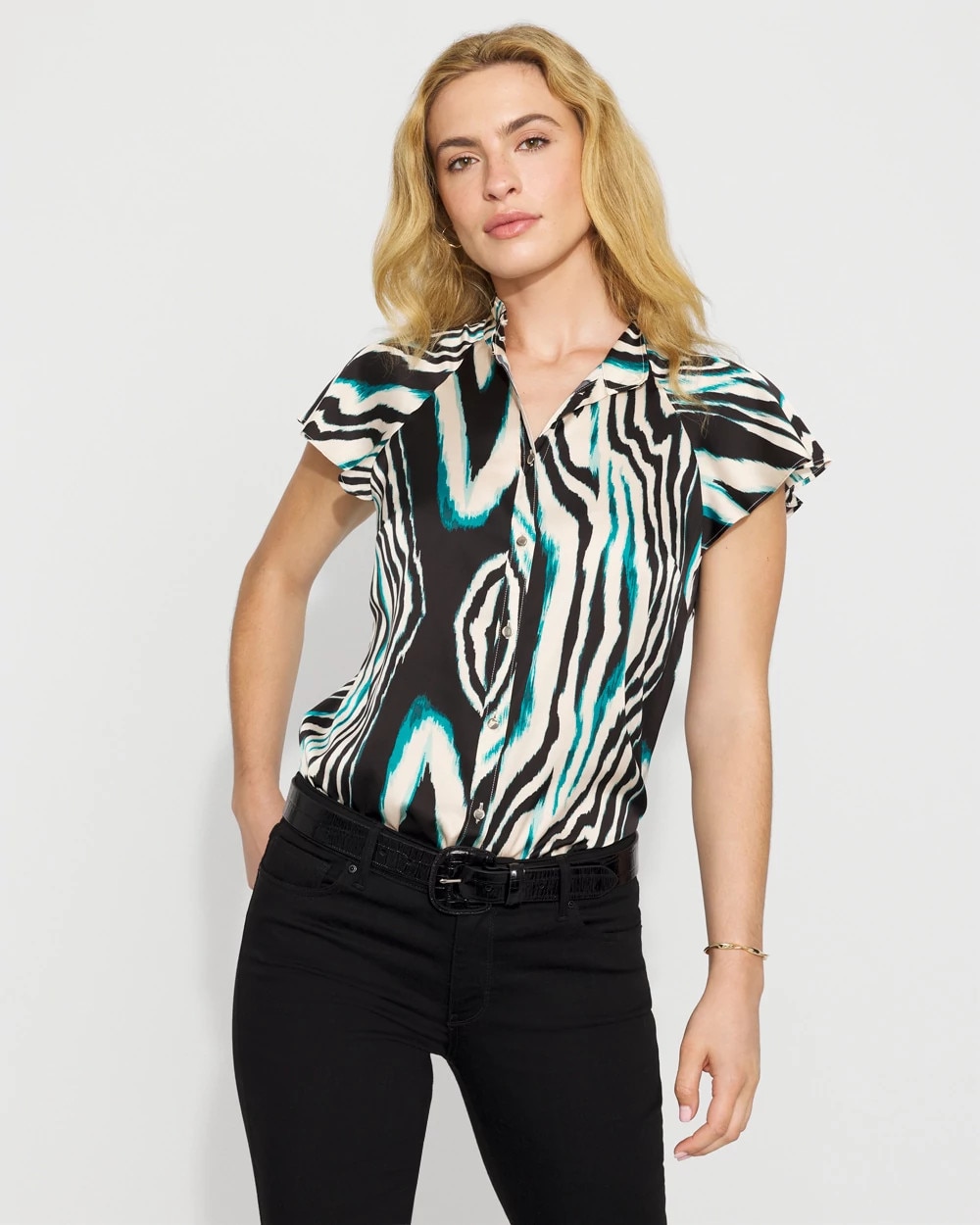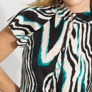 Gold buttons add a touch of shine to this feminine satin shirt. We’ve also given it flutter sleeves and a flattering Y-neckline. A stylish top to wear with pants to the office, or with a pair of jeans out to dinner .