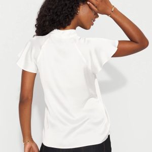 Gold buttons add a touch of shine to this feminine satin shirt. We’ve also given it flutter sleeves and a flattering Y-neckline. A stylish top to wear with pants to the office, or with a pair of jeans out to dinner .
