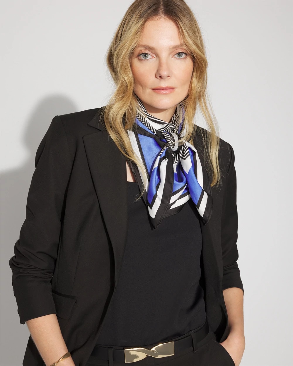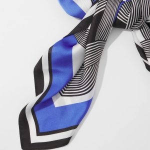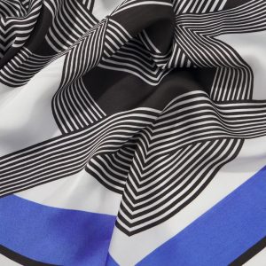 Make this scarf the finishing touch for your outfit. Designed with a black + white geometric pattern with contrasting blue trim, this square scarf will work tied around your neck, hair or your handbag. Match it with coordinating pieces from our apparel collection including a blouse, tank and skirt.
