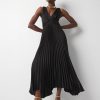 Dress for work or play in stunning dress crafted from a chiffon fabric with metallic clip dots for shine. The Godet pleats at the hem are a flirty detail that moves with you. The elbow sleeves and V-neck allow you to get creative with accessories. The tie-waist is removable.