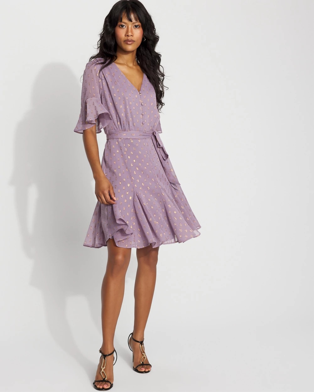 Dress for work or play in stunning dress crafted from a chiffon fabric with metallic clip dots for shine. The Godet pleats at the hem are a flirty detail that moves with you. The elbow sleeves and V-neck allow you to get creative with accessories. The tie-waist is removable.