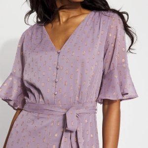 Dress for work or play in stunning dress crafted from a chiffon fabric with metallic clip dots for shine. The Godet pleats at the hem are a flirty detail that moves with you. The elbow sleeves and V-neck allow you to get creative with accessories. The tie-waist is removable.