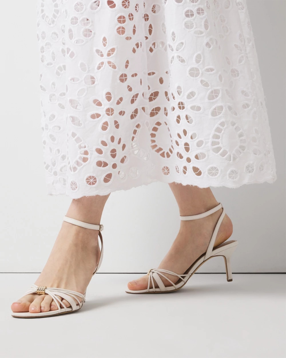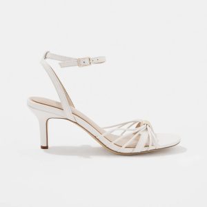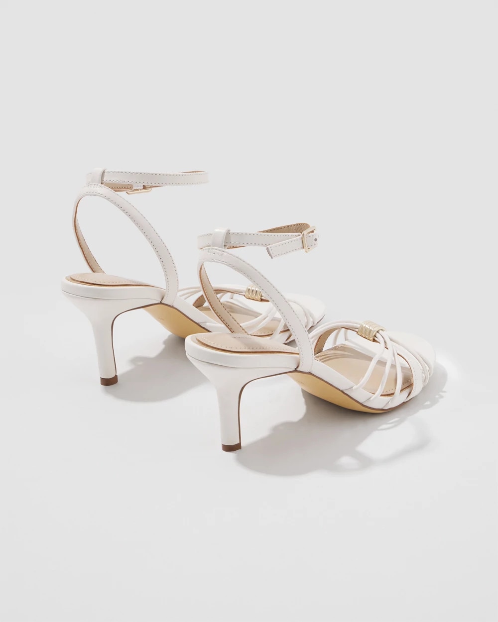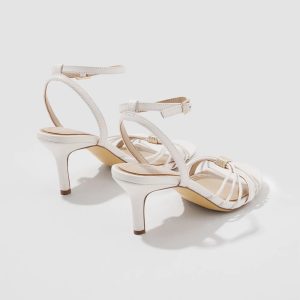 The ecru leather on these strappy heeled sandals makes them an ideal choice for summer parties. But it’s the 12K gold sculptural hardware at the center that elevate this sandal for truly special occasions.