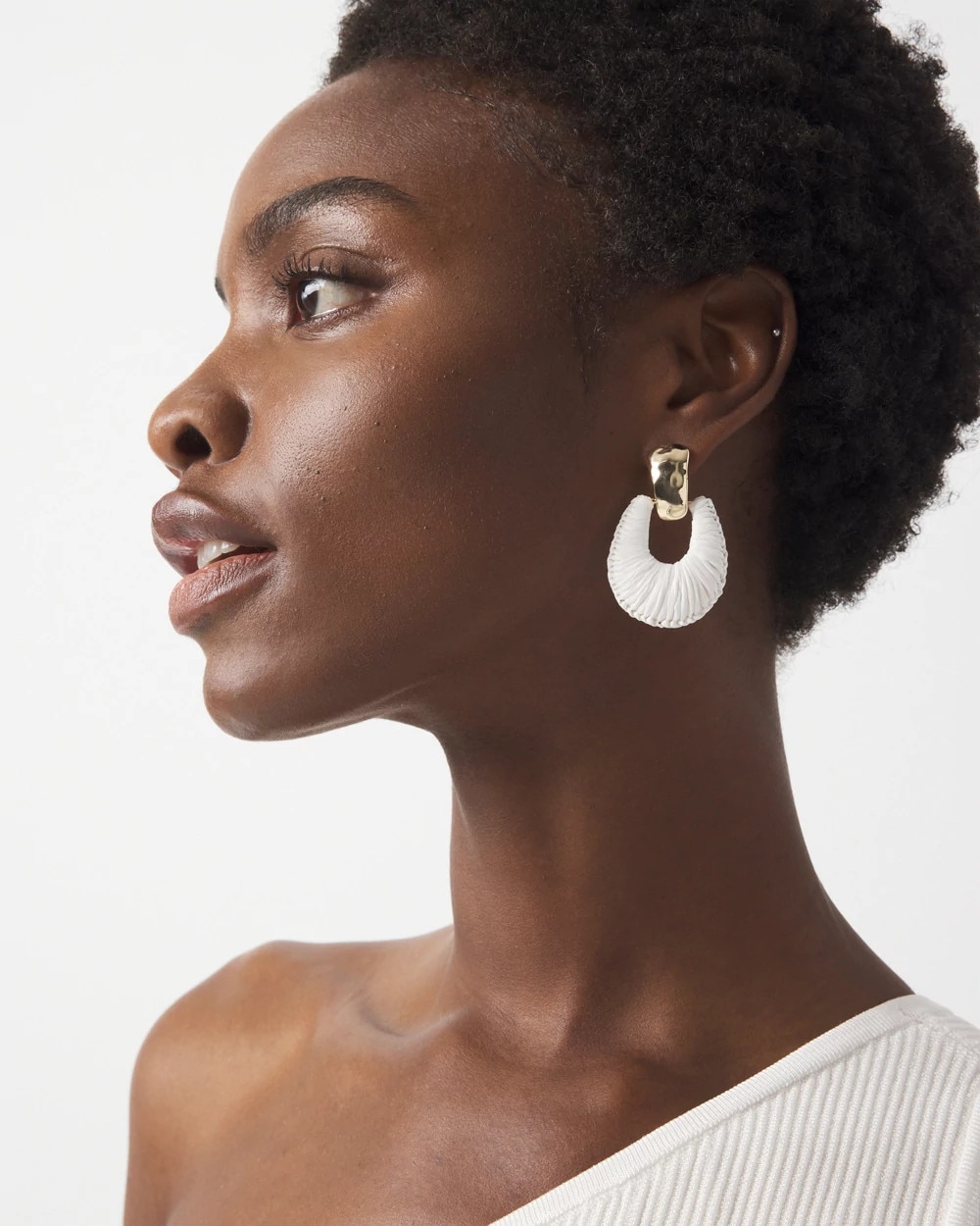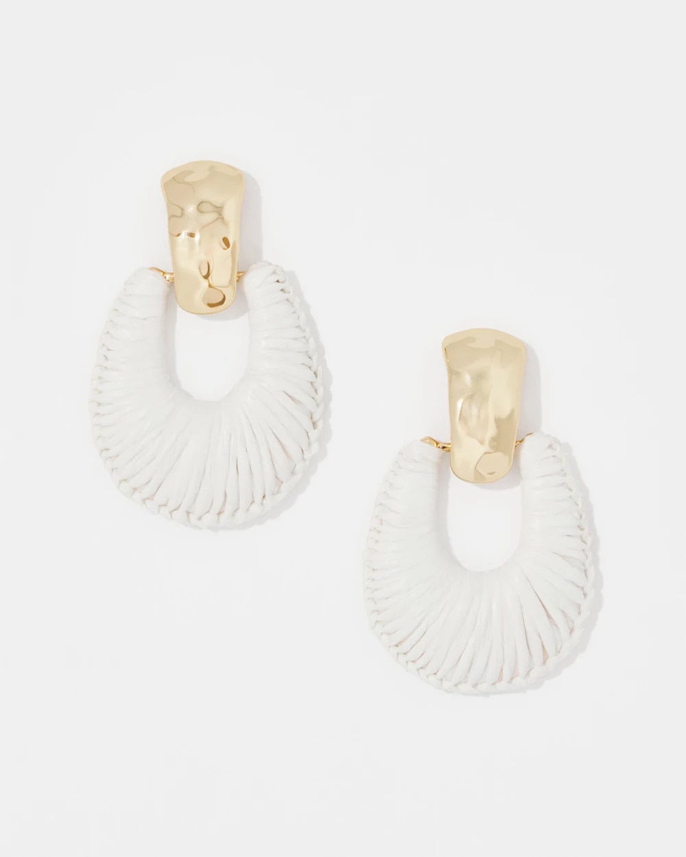 Hammered gold and ecru raffia give these drop earrings an artisanal look. Pair with other pieces from our summer collection.
