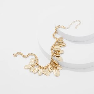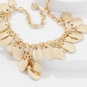 Multiple gold-tone hammered discs create a statement necklace that instantly elevates V-neck tops and dresses. Wear it with matching earrings and bracelet.