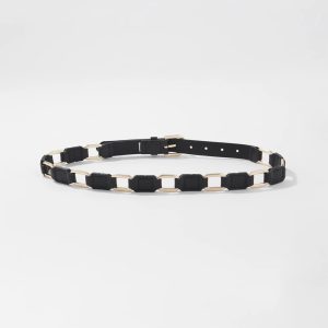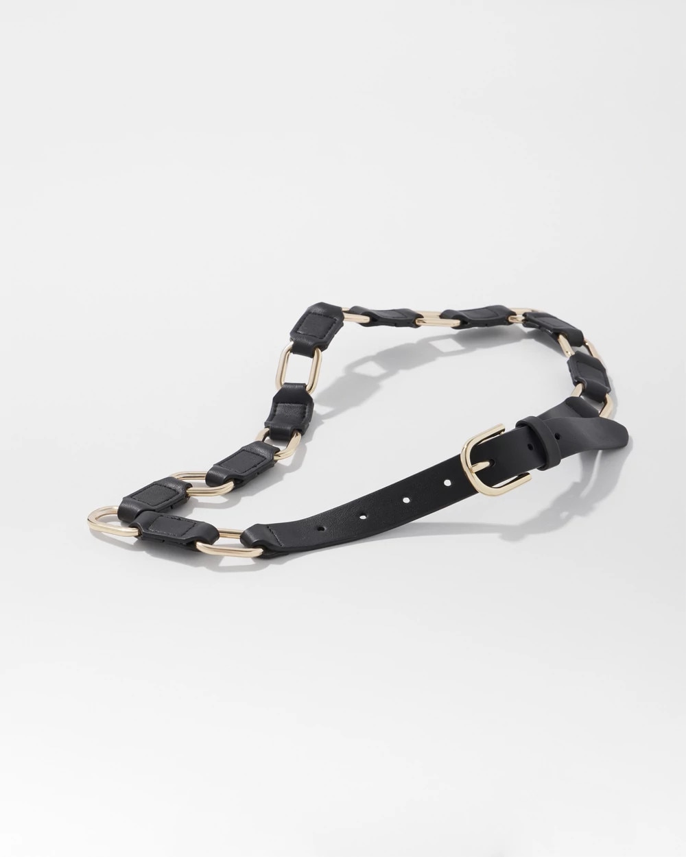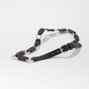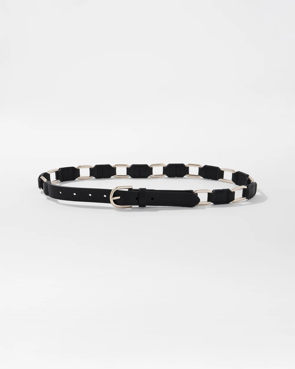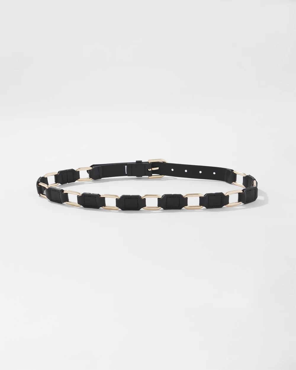 Add something extra to pants and denim with this gold link skinny pant belt. The gold link details sit at the back of the faux leather belt and will work with any style of pant or jean.