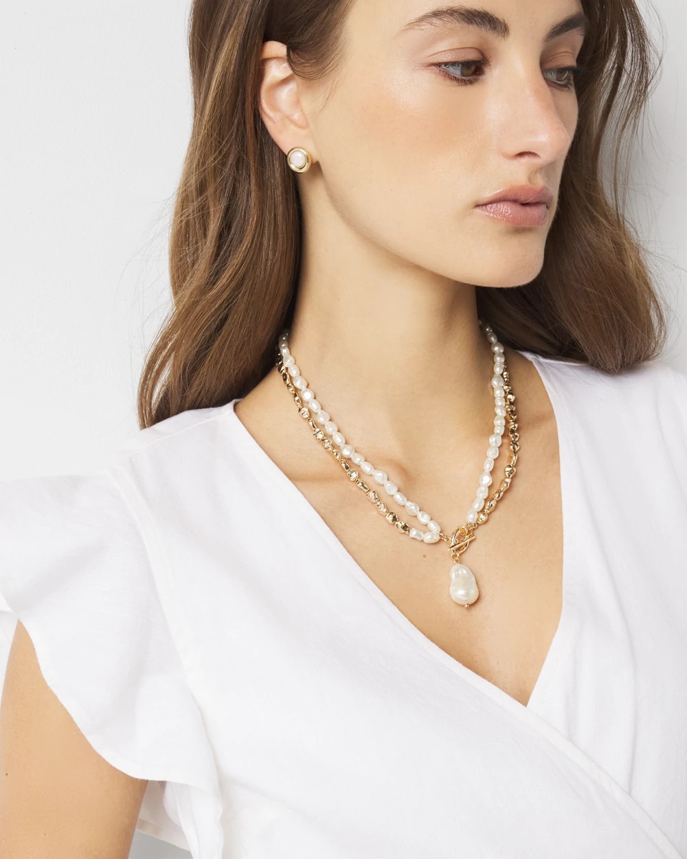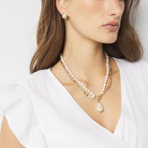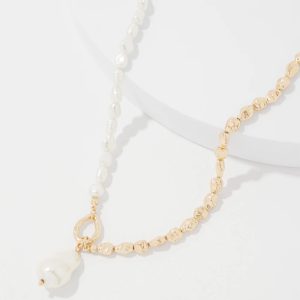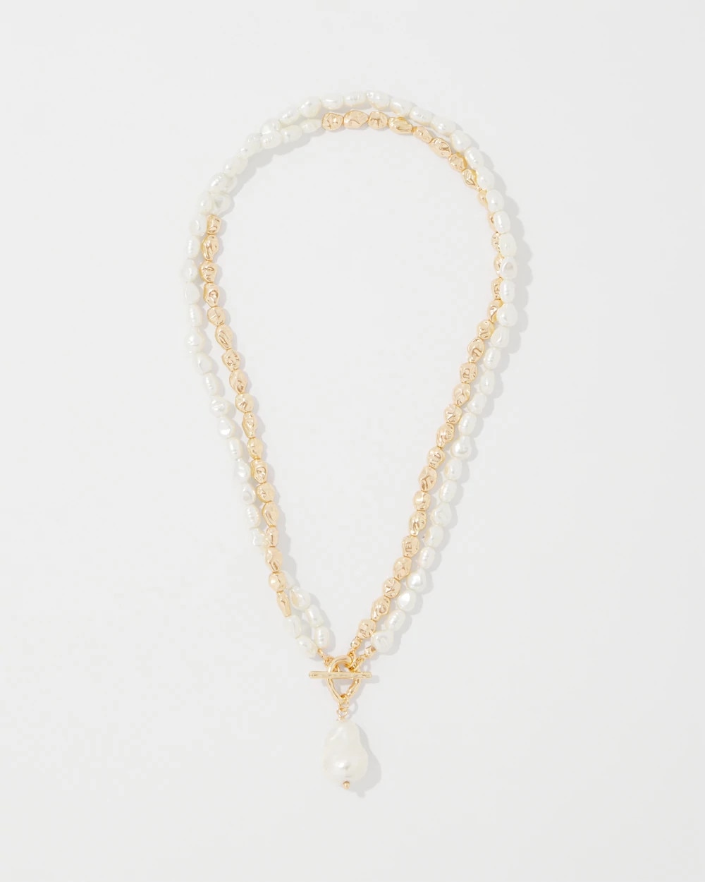 A large single faux pearl is the focal point of this two-strand necklace that easily converts into one long single strand piece. An easy way to elevate any outfit. Mix and match with other pieces from our Baroque Pearl Collection.
