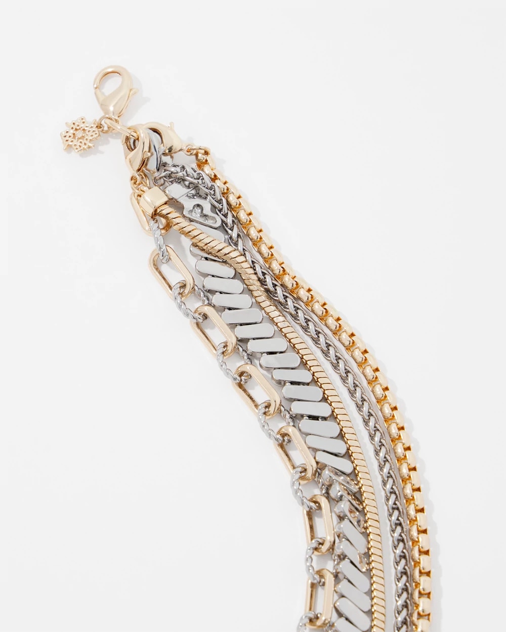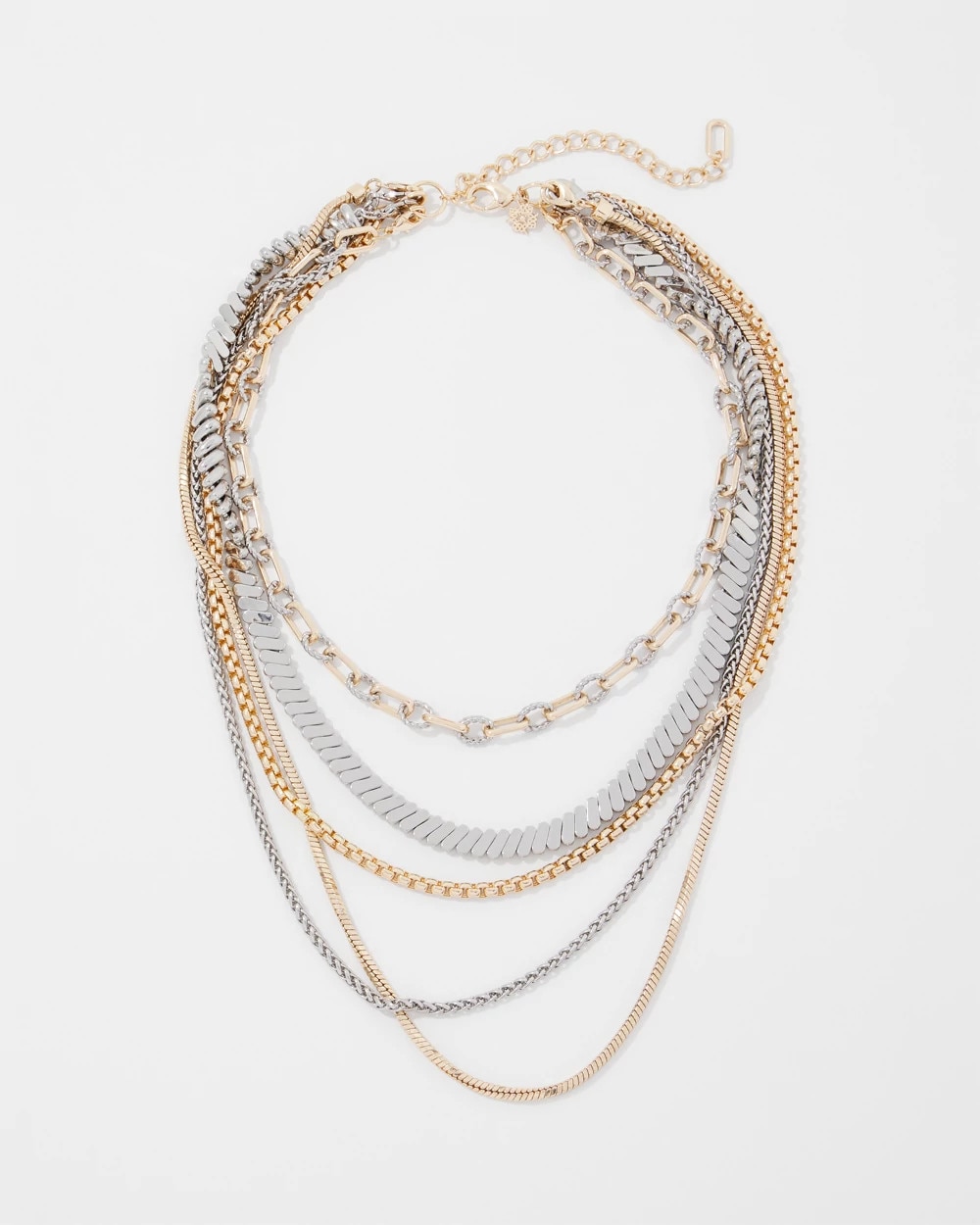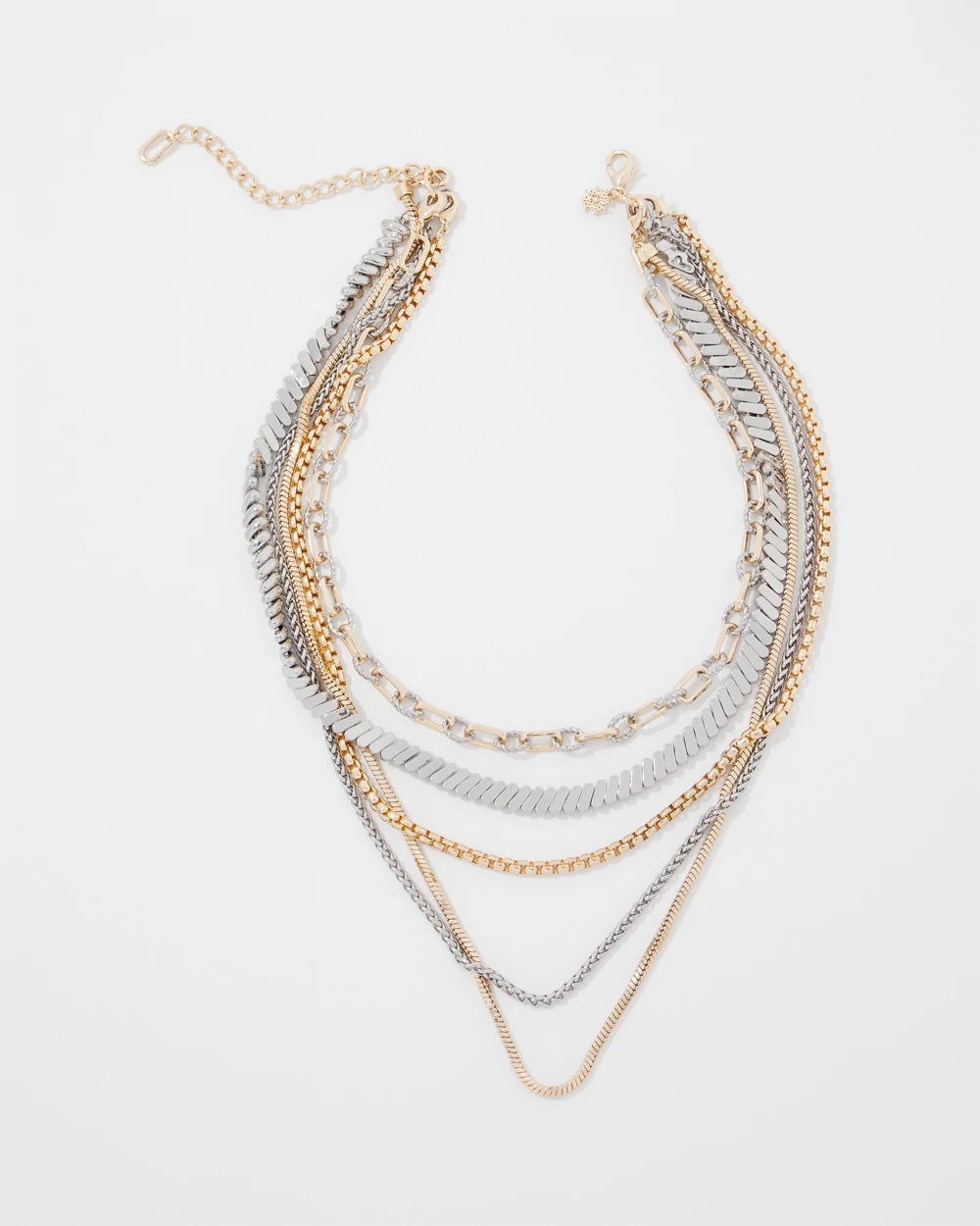 Layer on a touch of shine with this mixed chain of gold and silver necklaces with various link shapes and sizes. Wear them together or separately to create multiple looks.
