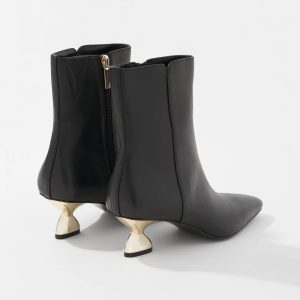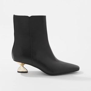 This leather low heel ankle boot has a twisted gold heel that will instantly elevate black pants. Shop the Twisted Metals Collection for coordinating belt, bag and sandal.