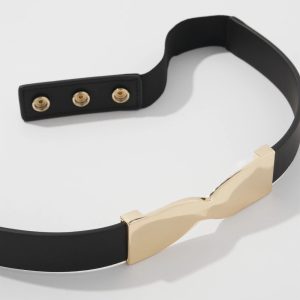 A twist of gold at the center front of this stretch belt resembles a bow, making it a feminine touch to add to dresses and longer tops. Designed with a snap closure and elastic for ease. Mix and match with other pieces from the Twisted Metals Collection which includes jewelry and accessories.