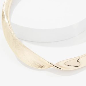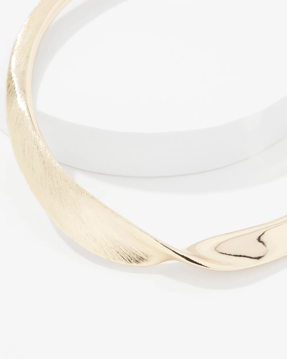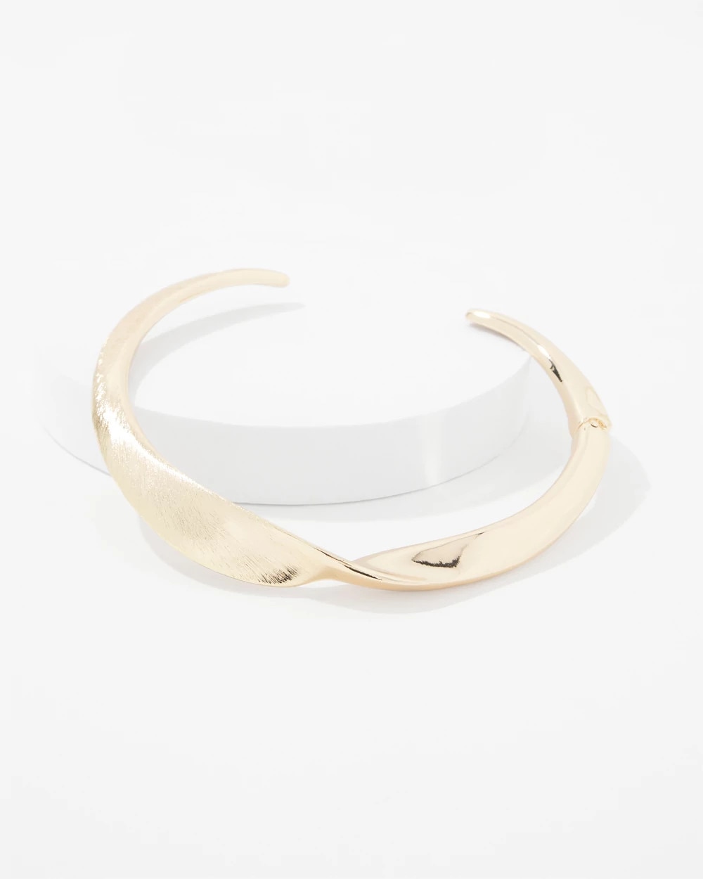 This collar is designed with a twist in the center, one side is crafted in brushed gold and the other side is smooth + shiny. An easy way to elevate your dresses and tops.