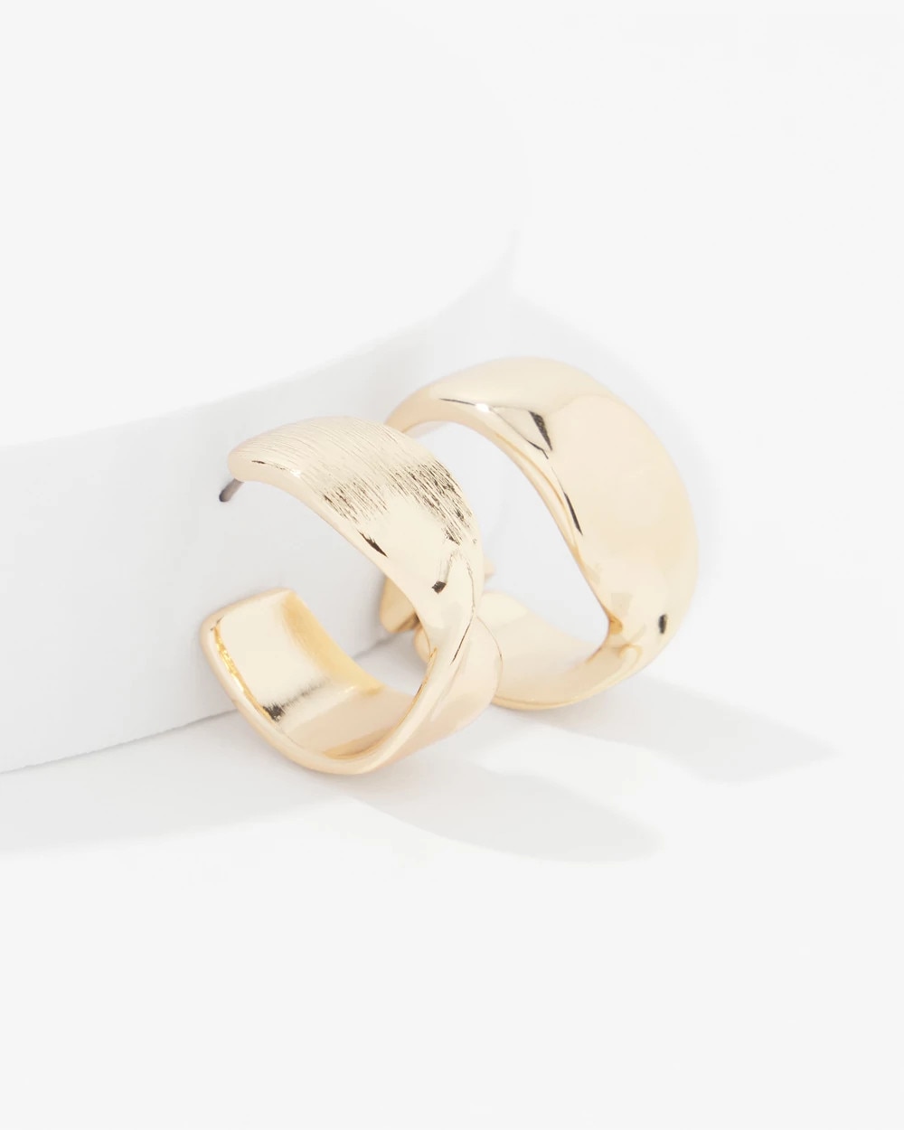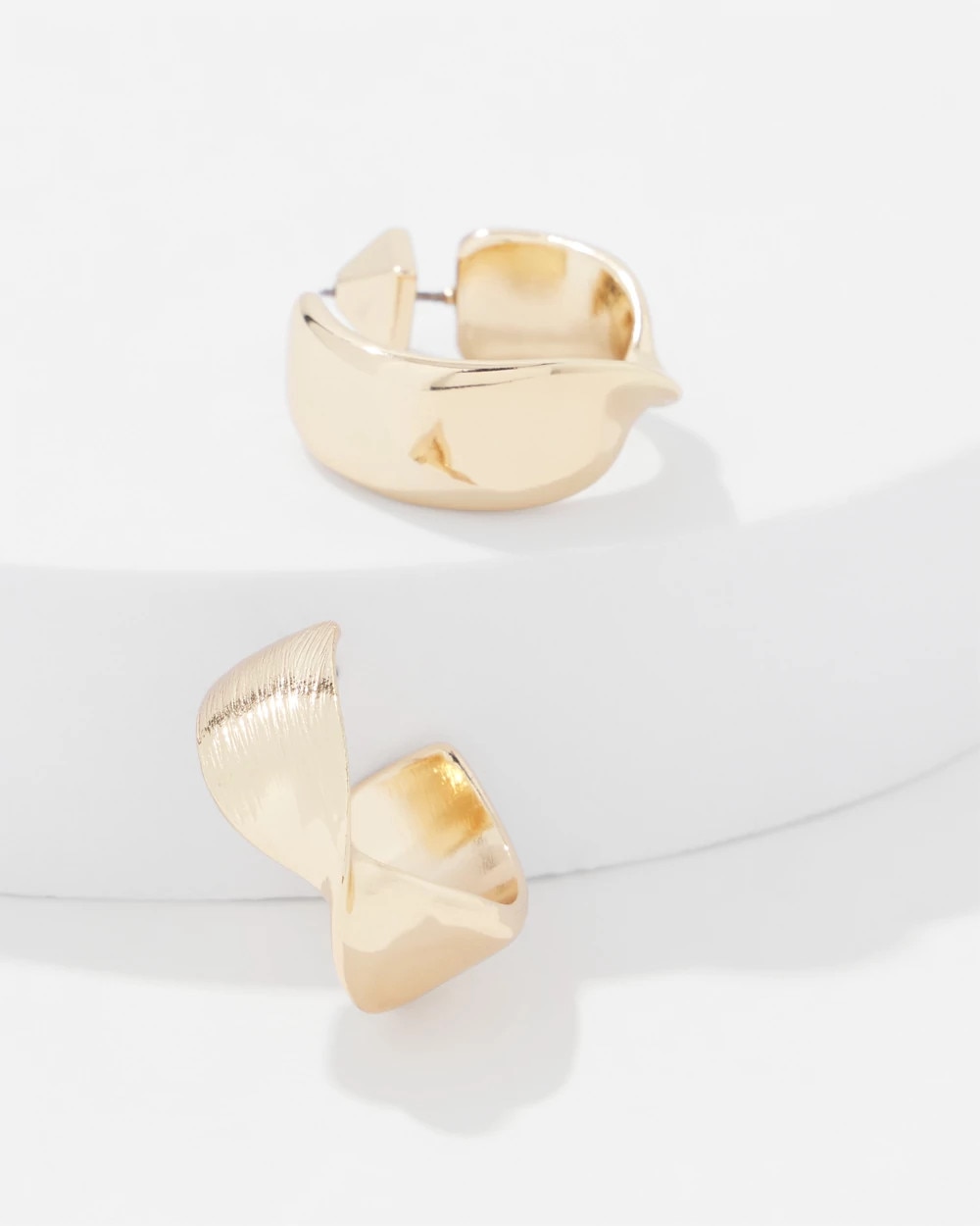 These gold earrings have a twist design with brushed details on top, and smooth gold on the bottom. Pair with other pieces in the Twisted Metals Collection.