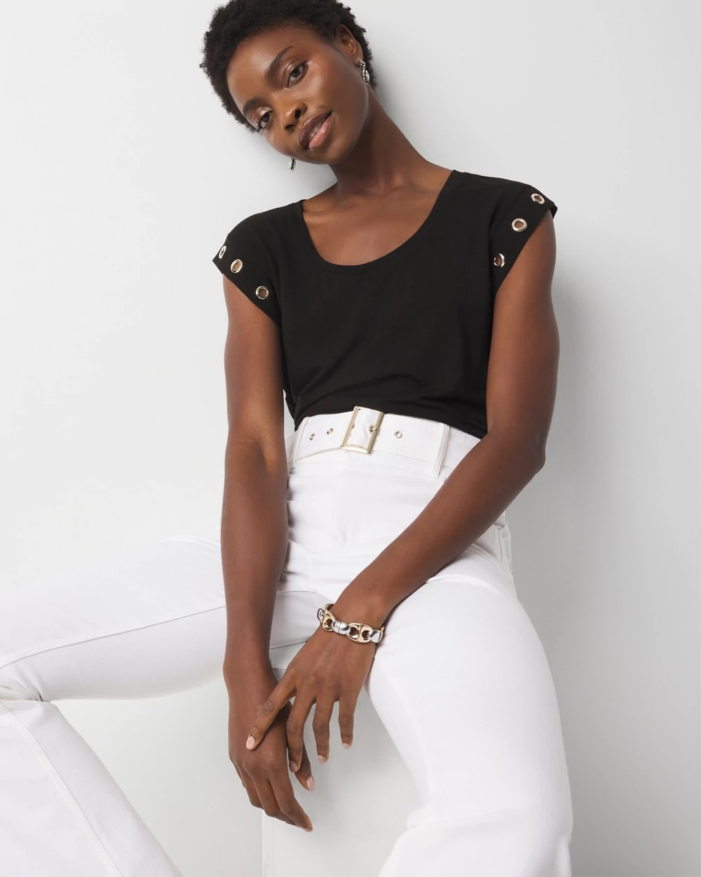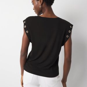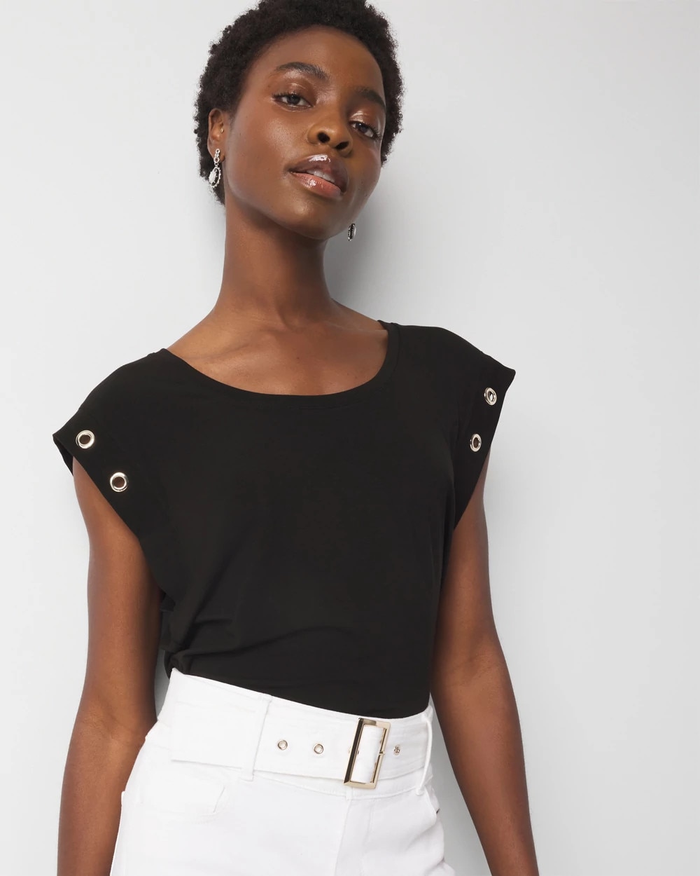 Refresh your t-shirt wardrobe with this scoop neck top with grommet details on the cuffs. A great look for denim or shorts.