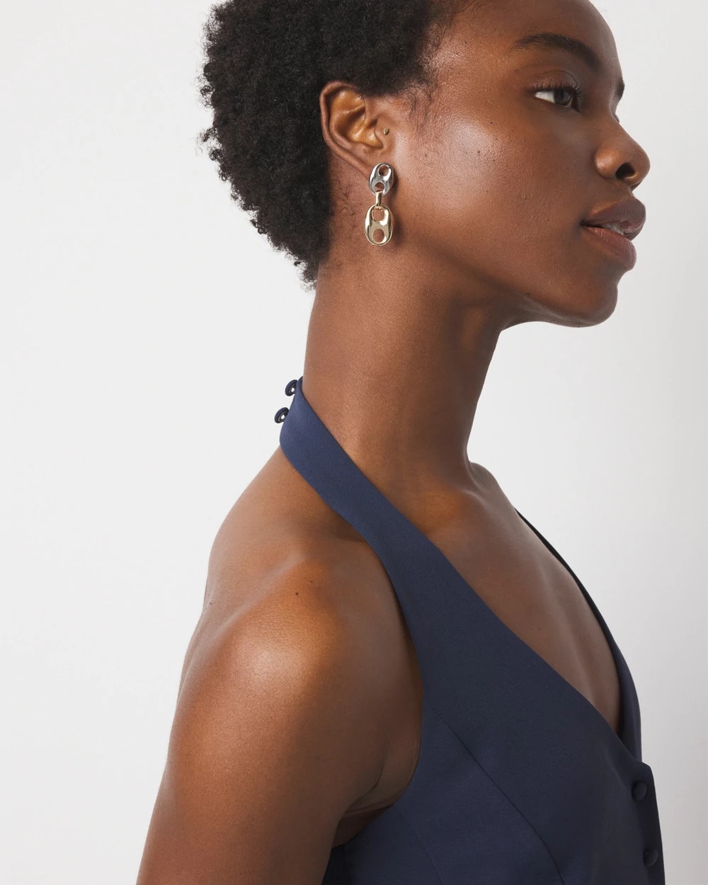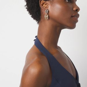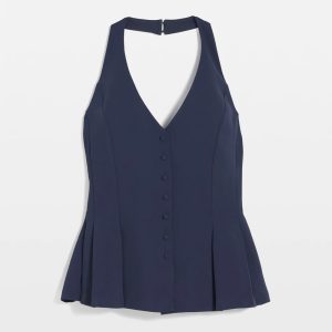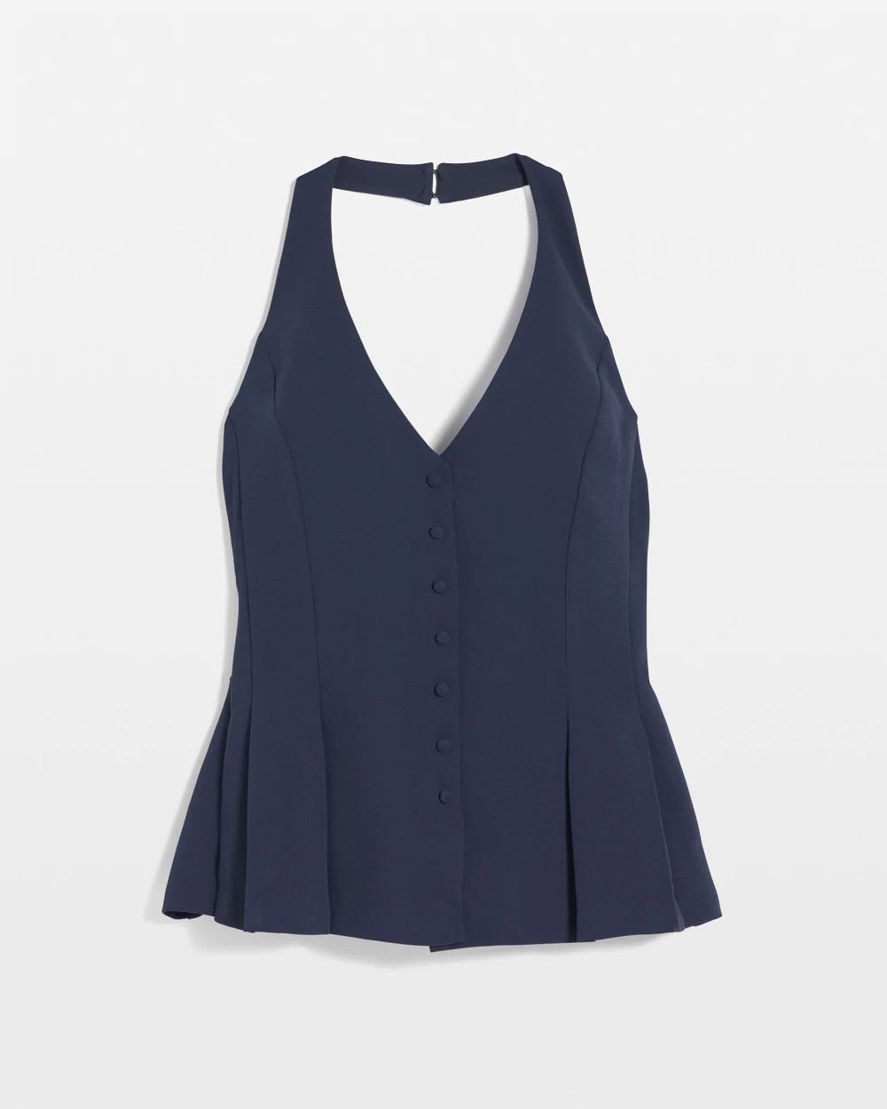 This halter top has a row of buttons down the center front as a design detail (they’re non-functional) and a feminine peplum hem. A back zipper as well as hook & eye at the back of the halter neck gets you in and out. The summer crepe fabric is the perfect weight for the season and pairs perfectly with our matching open front jacket, crepe tailored short and wide leg pant.