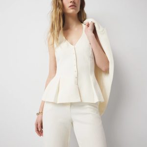 This halter top has a row of buttons down the center front as a design detail (they’re non-functional) and a feminine peplum hem. A back zipper as well as hook & eye at the back of the halter neck gets you in and out. The summer crepe fabric is the perfect weight for the season and pairs perfectly with our matching open front jacket, crepe tailored short and wide leg pant.