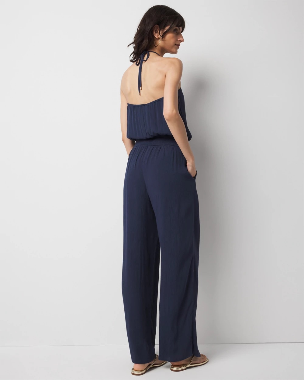 Summer beach season calls for a chic cover up. Look no further than this halter style jumpsuit with O-ring hardware. Made from a crinkle viscose fabric with an elastic waist for ease, this coverup is sheer + lightweight, a perfect look to go from beach to brunch to bar.