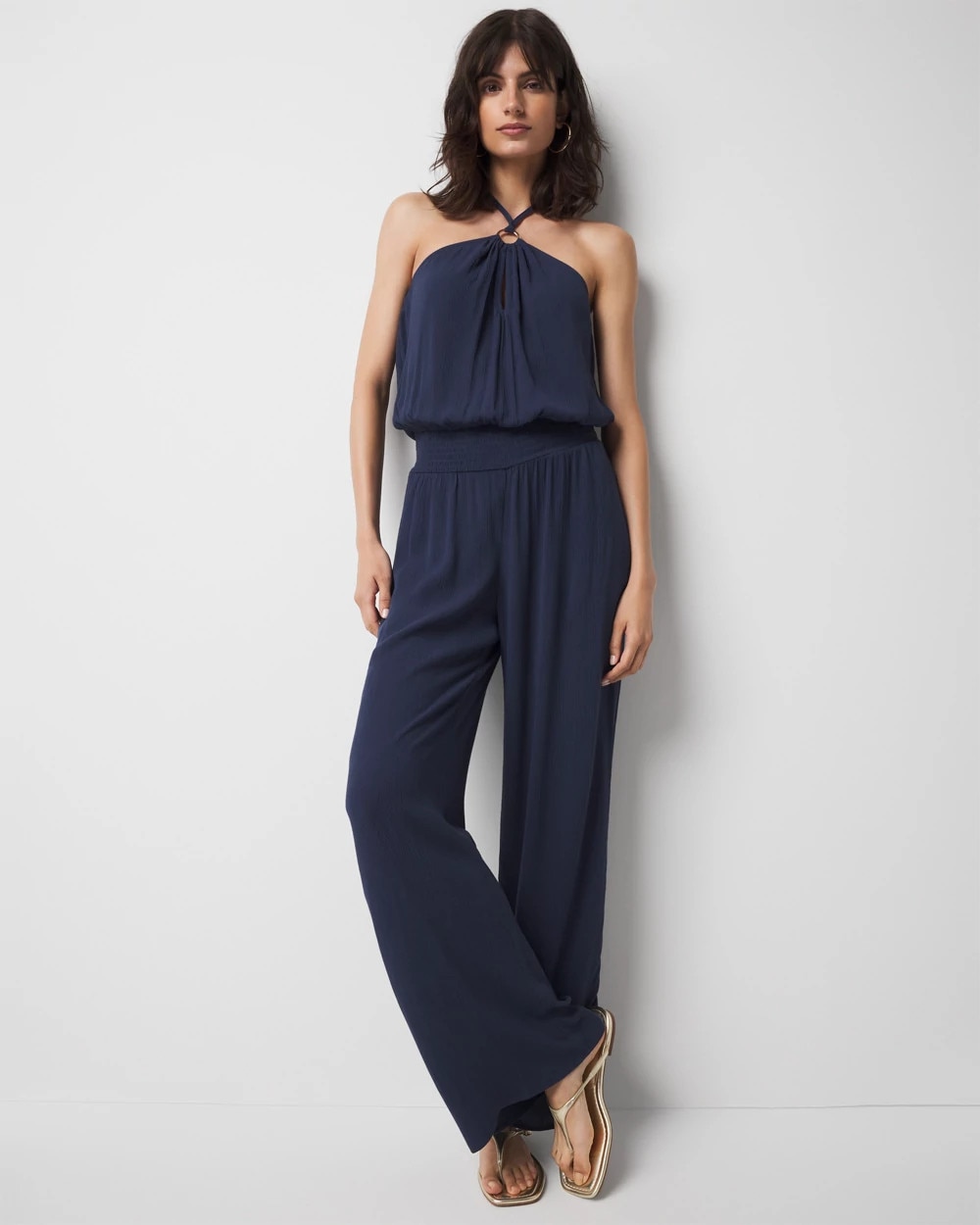 Summer beach season calls for a chic cover up. Look no further than this halter style jumpsuit with O-ring hardware. Made from a crinkle viscose fabric with an elastic waist for ease, this coverup is sheer + lightweight, a perfect look to go from beach to brunch to bar.