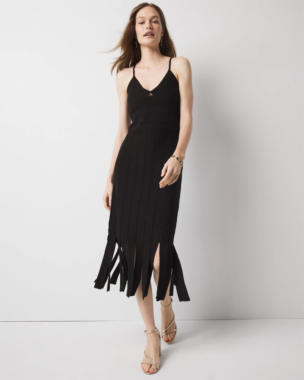 Fun, flirty and glam, this sweater halter dress gets full style props from its on-trend fringe hemline that moves when you do. Other design details include novelty stitching in the skirt, a bare back with a tie across the back and a small cutout beneath the plunging V-neck. Just add heels and sashay away.