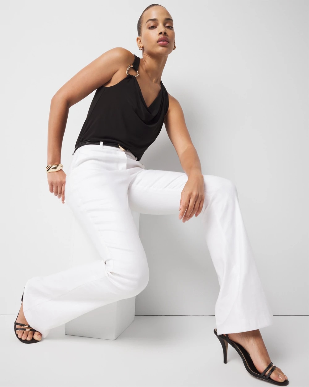 Made from soft matte jersey, this cowl neck tank has hardware on one shoulder for added sophistication. Pair it with matching pant for head-to-toe chic.