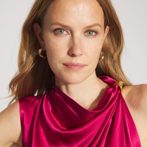 A satin slip dress has a gathered shoulder and soft gold hardware for adornment. The bodice is cut on the bias with a straight A-line skirt. A sleek + feminine look for a special night out.