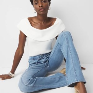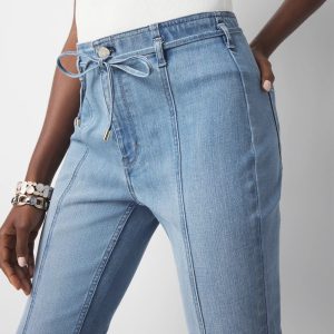 This skinny flare jean has front seam details and a Hollywood waistline to elongate the leg. A skinny self-tie belt adds definition. Pair with heels and a fitted tee or WHBM FORME™.