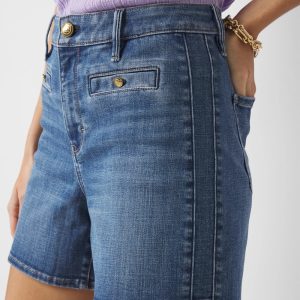 These jean shorts are not your mother’s cut-offs. Tailored and elevated, these shorts have a novelty pocket design with crest buttons. Back darts and side seam stitching details give you shape.
