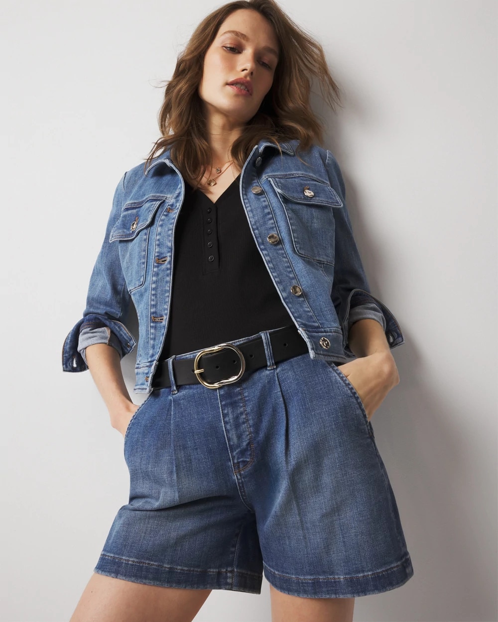 A dressy denim short that is designed with front pleats and seaming in back. Front slant pockets and back pockets and gold hardware help create a tailored look that works with heels or flats.
