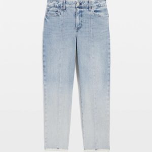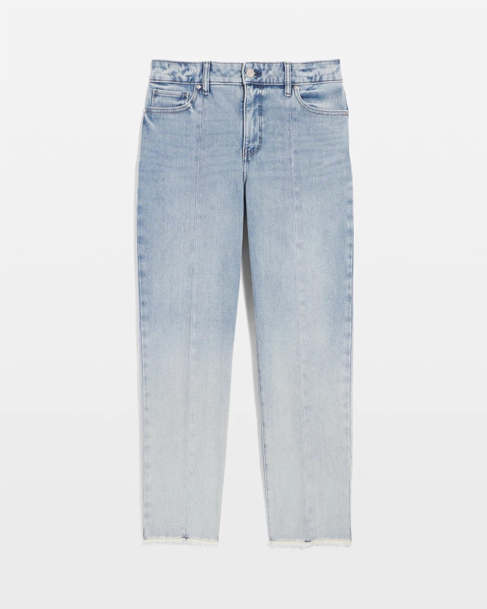 The perfect summer jean but make it fashion. Pintuck seams down the front and back, an ombre wash, raw edged hem and a back slit elevate these high-rise straight jeans. You’re welcome.