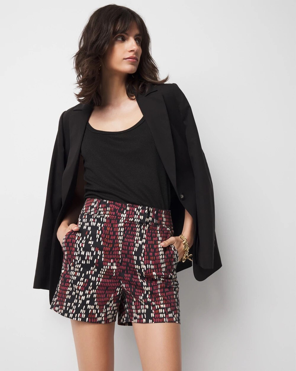 An abstract snake print turns these tailored shorts into a fashion statement. Designed with front slant and back welt pockets, these shorts are easy to dress up with sandals or heels.