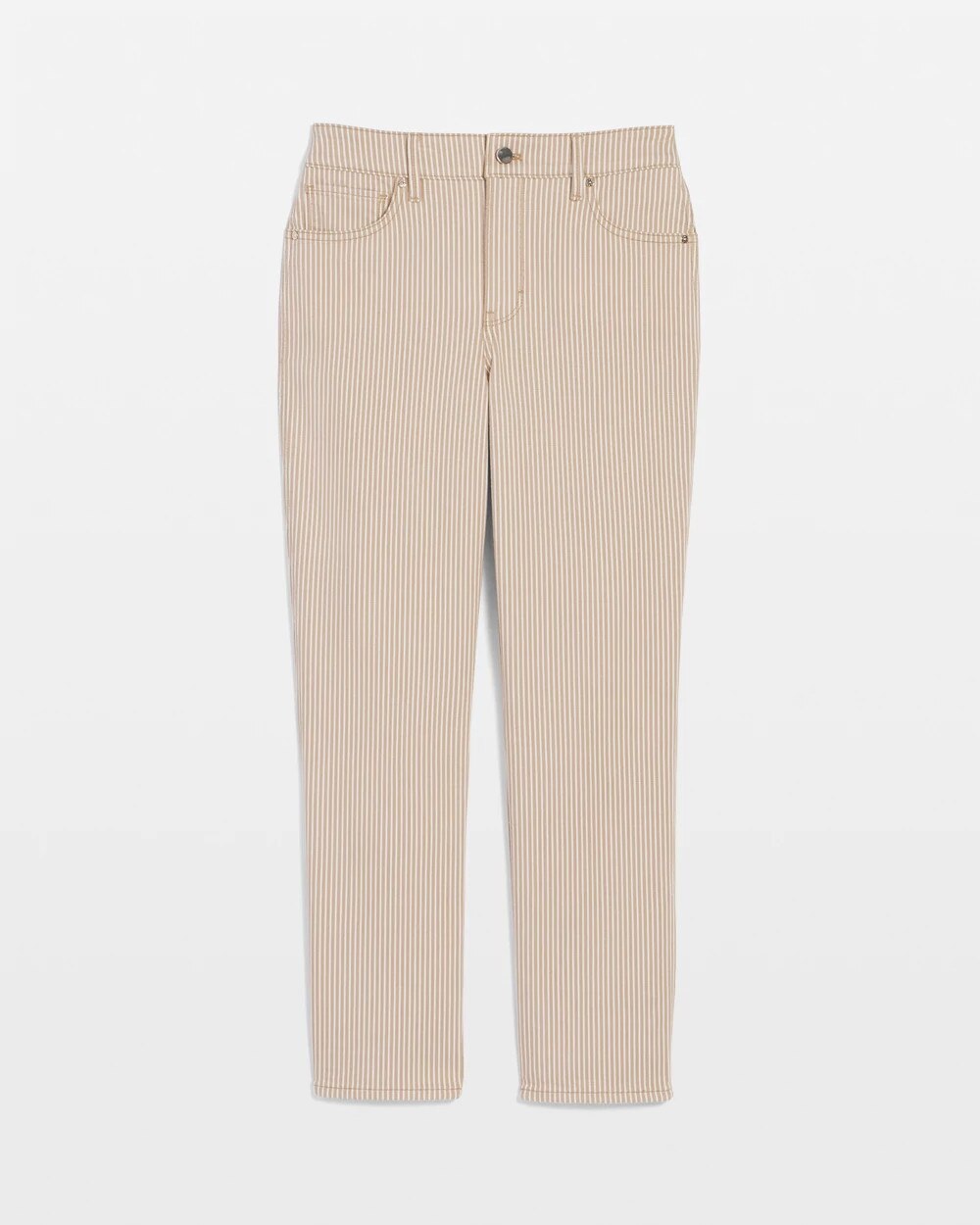 Show your stripes with this stylish pair of high-rise straight five-pocket jeans. The yarn-dyed stripe pattern is a summer classic that will quickly make these jeans your go-to.