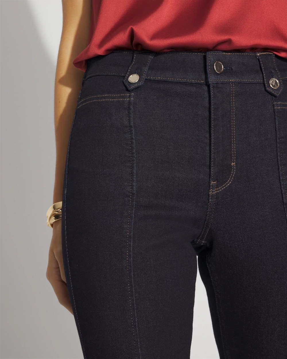 Hammered buttons and tabs add a stylish embellishment to these dark-washed bootcut jeans. We’ve also designed this pair with a front-seam to add a touch of polish. Pair with heels or boots and these are office ready or date night perfection. We also heard you on our inseam and we’ve shortened our regular length, while keeping the short and long lengths you love.