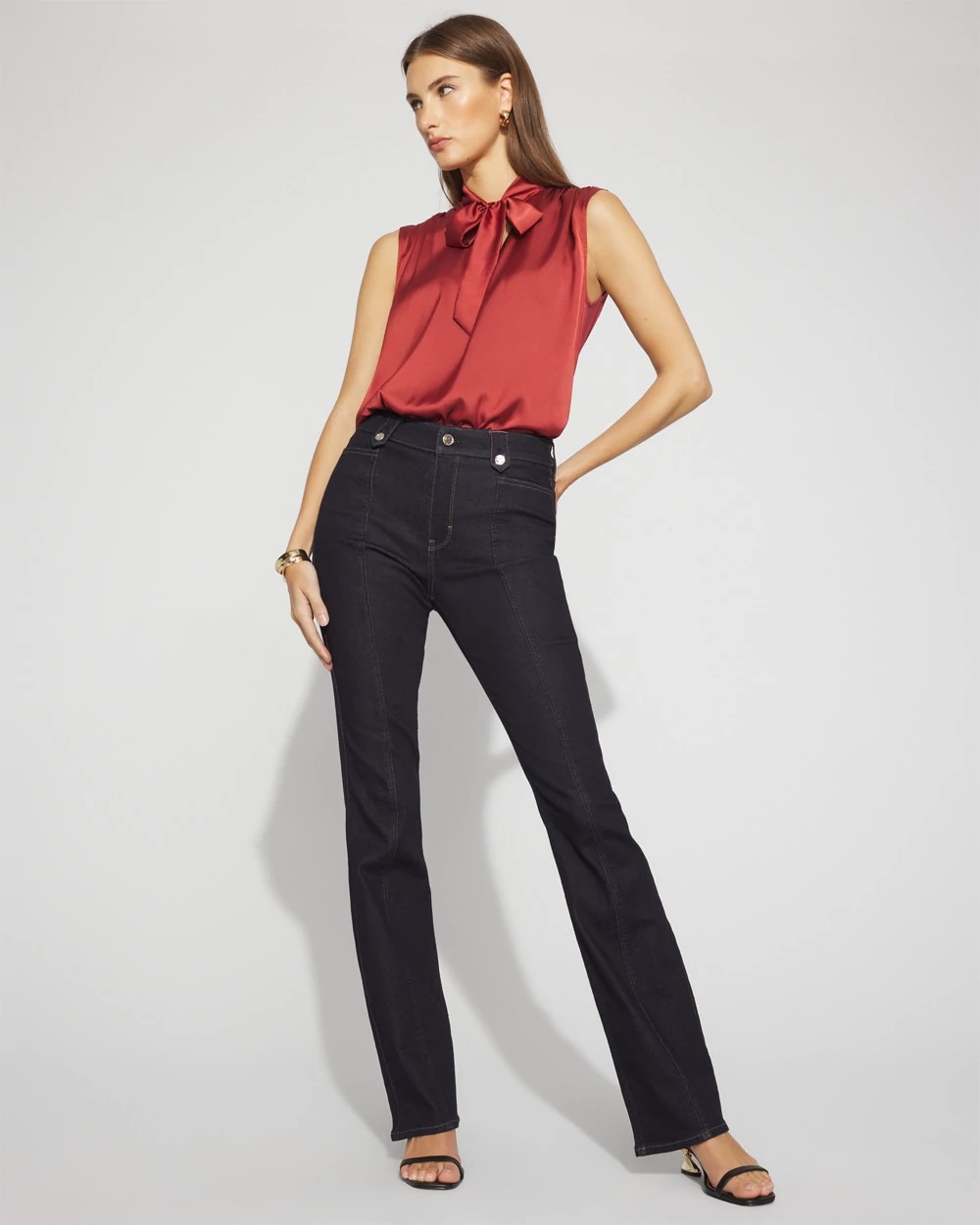 Hammered buttons and tabs add a stylish embellishment to these dark-washed bootcut jeans. We’ve also designed this pair with a front-seam to add a touch of polish. Pair with heels or boots and these are office ready or date night perfection. We also heard you on our inseam and we’ve shortened our regular length, while keeping the short and long lengths you love.