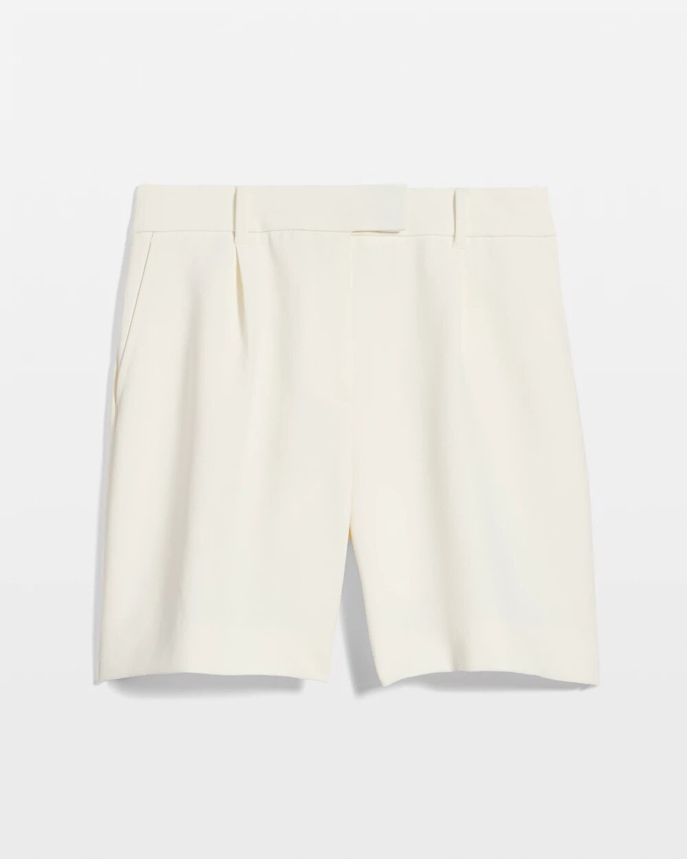 These timeless shorts are cut from a crepe fabric and have a flattering front pleat, belt loops and front pockets. The overall look is tailored, which makes these shorts worthy of dinner out with strappy sandals or to the over with a blazer and pumps. Pair with matching bustier or vest and our open front blazer.
