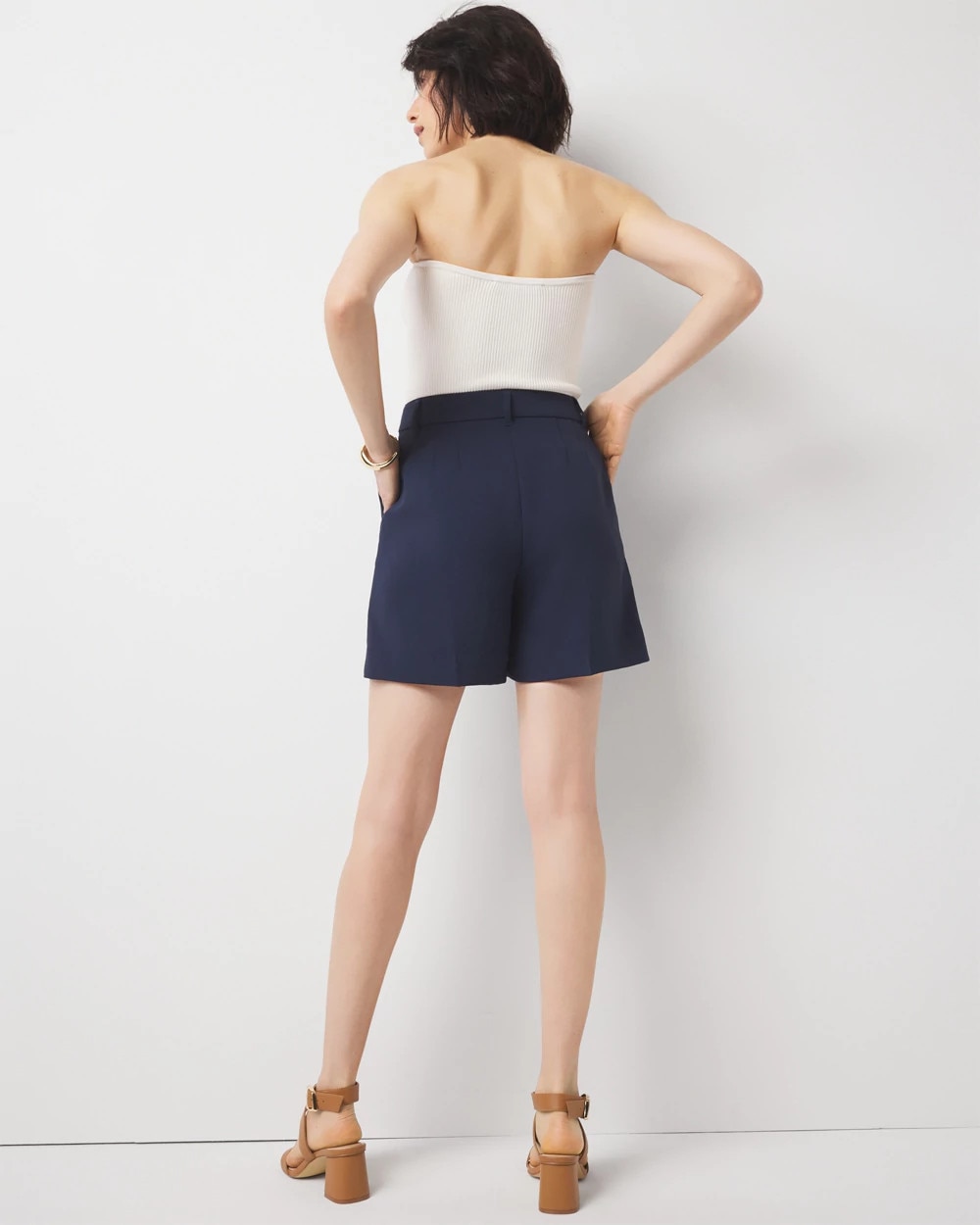 These timeless shorts are cut from a crepe fabric and have a flattering front pleat, belt loops and front pockets. The overall look is tailored, which makes these shorts worthy of dinner out with strappy sandals or to the over with a blazer and pumps. Pair with matching bustier or vest and our open front blazer.