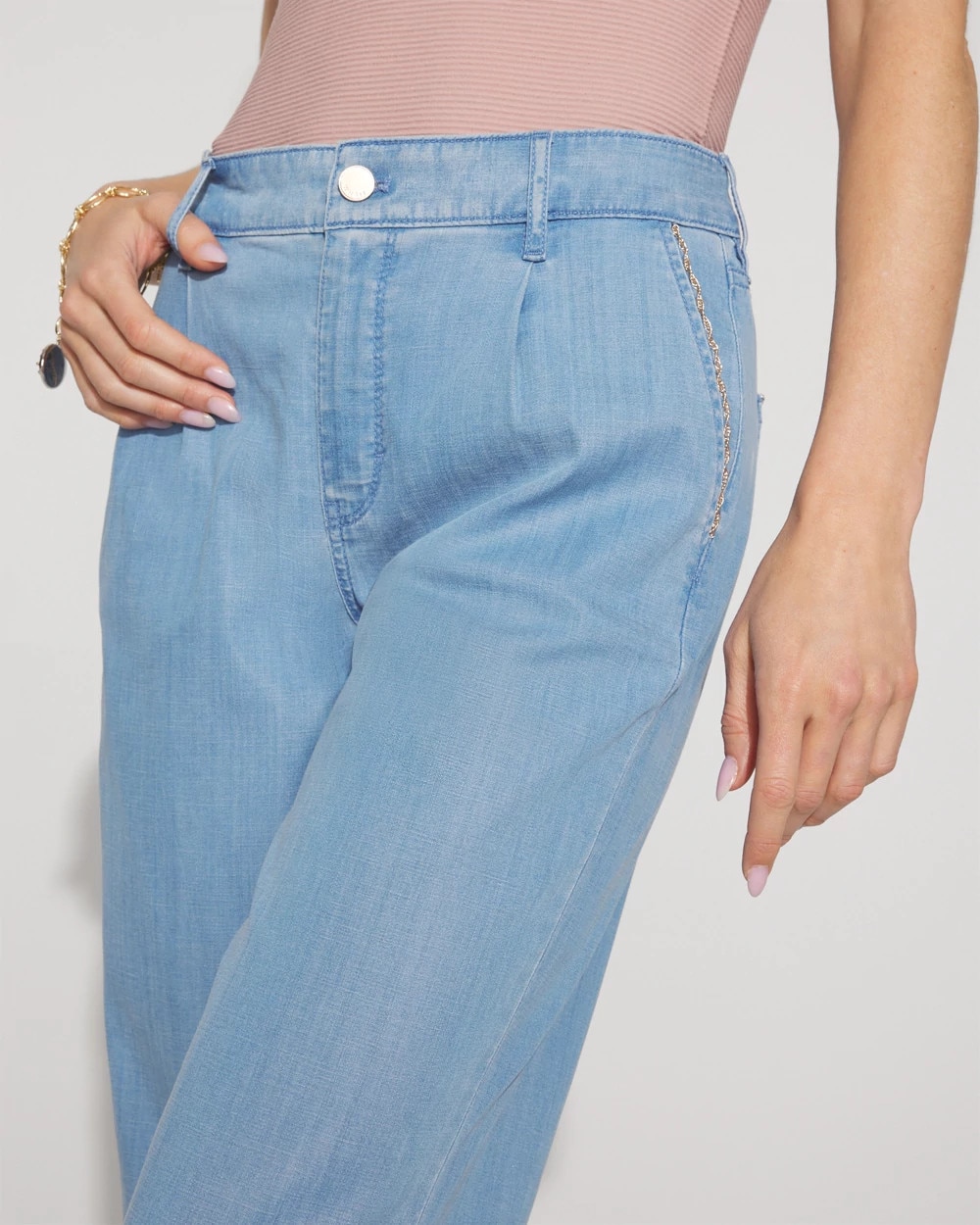 Our popular wide-leg denim silhouette is elevated by front pleats and chain detail trim on the front slash and back pockets. Made from a lightweight lyocell fabric that’s comfortable all-year round. We also heard you on our inseam and we’ve shortened our regular length, while keeping the short and long lengths you love.