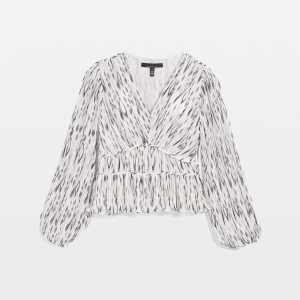 Allover pleats, peplum hem and seam details to define the waist will flatter and add a touch of romance to your outfit. The ikat print is timeless and adds a striking look to this boho-chic blouse. Elastic at the cuffs allow for a blouson effect.