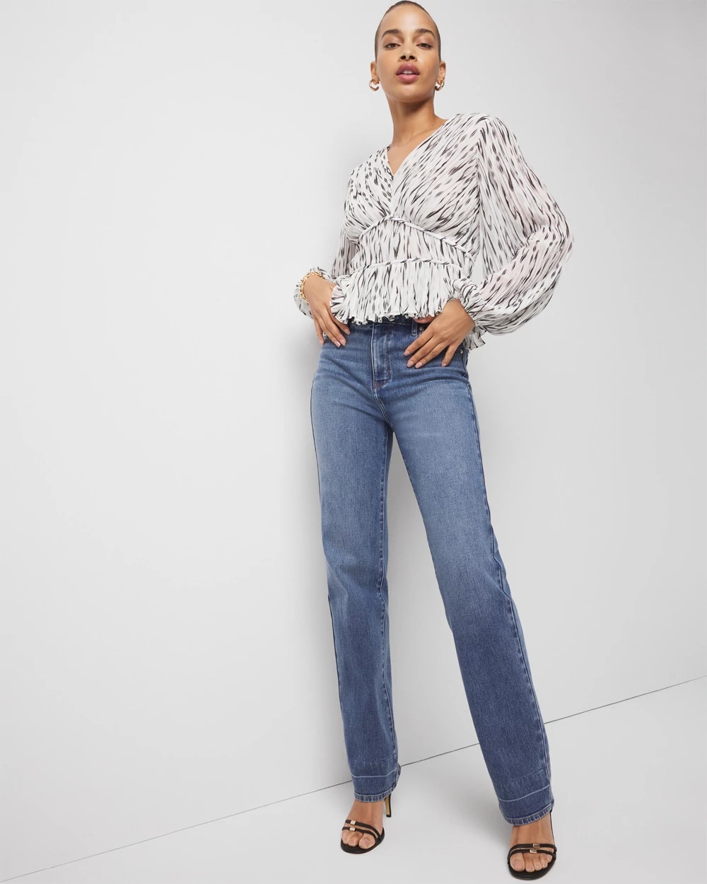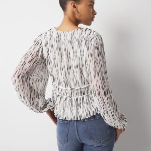 Allover pleats, peplum hem and seam details to define the waist will flatter and add a touch of romance to your outfit. The ikat print is timeless and adds a striking look to this boho-chic blouse. Elastic at the cuffs allow for a blouson effect.