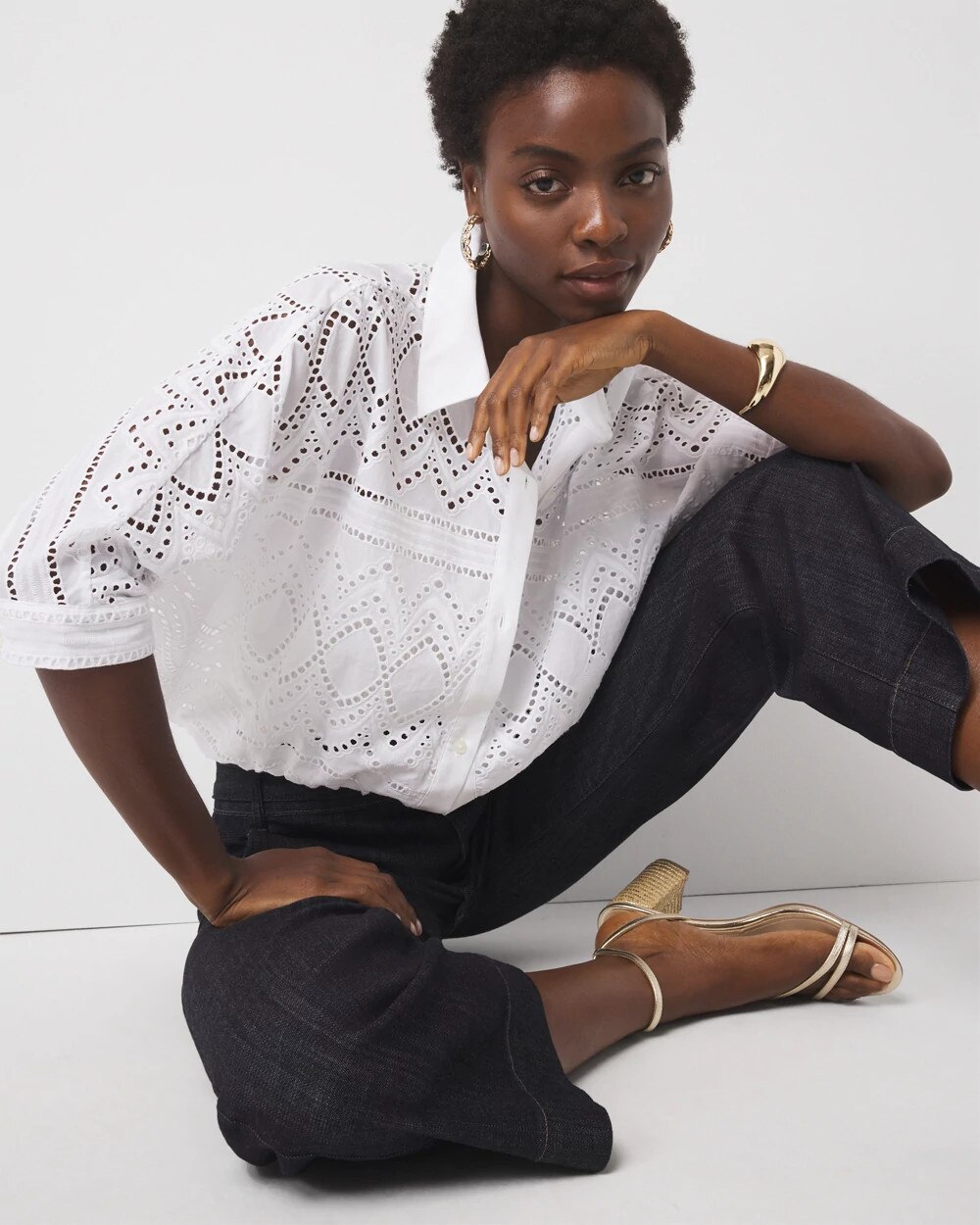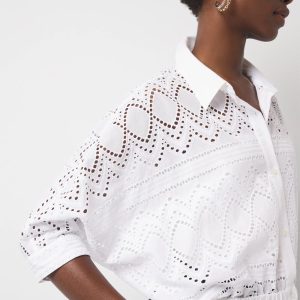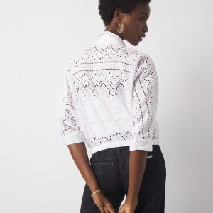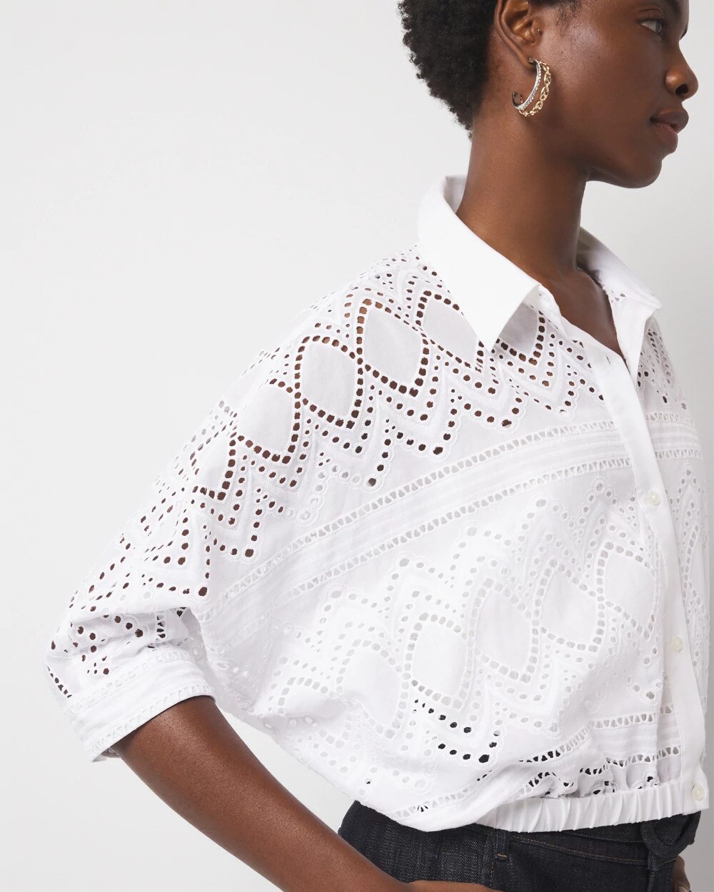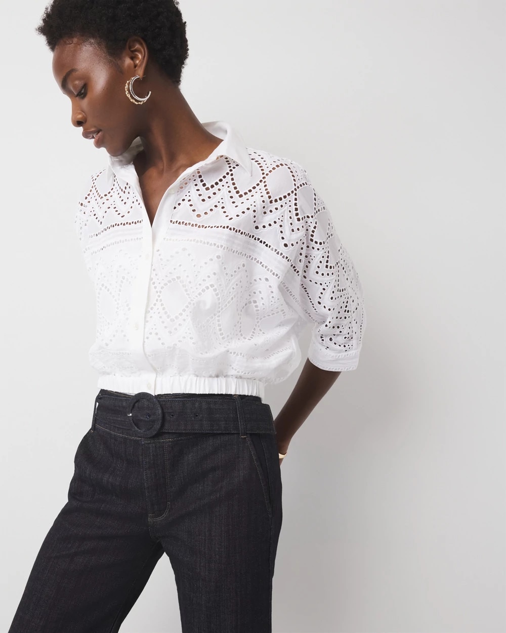 This pretty 100% cotton eyelet shirt has elbow length kimono sleeves and an elastic waistband. There is a full front button placket for closure and buttons at the cuff. This shirt is see-through so we suggest pairing it with WHBM FORME™.