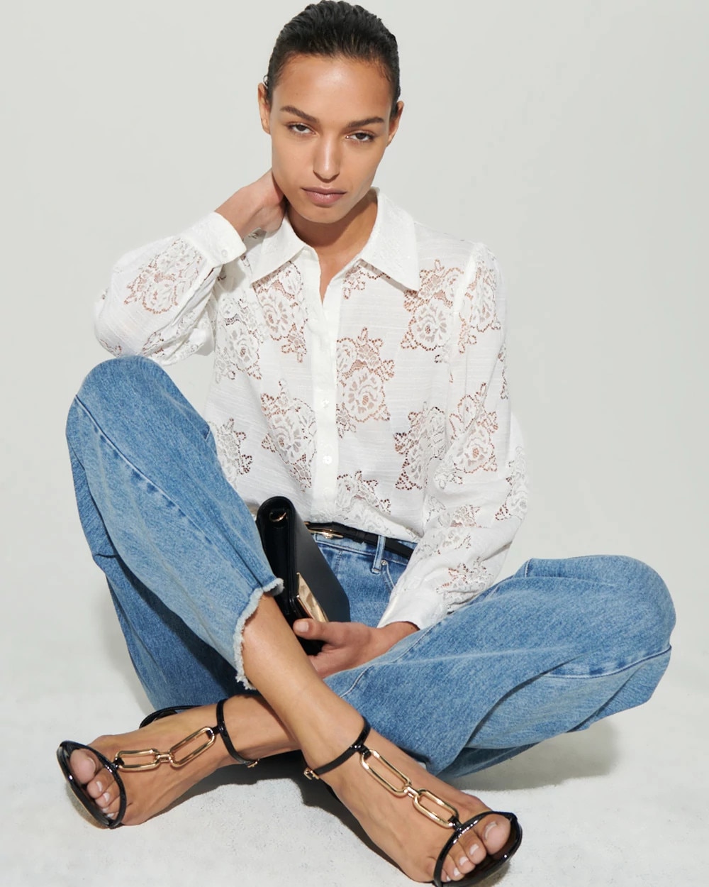 Crafted from feminine lace, this long-sleeve button-down shirt has a collar, front button placket and cuffs. The allover lace finishes in a scalloped hem. This shirt is sheer so layer it under WHBM FORME™ or a cami.