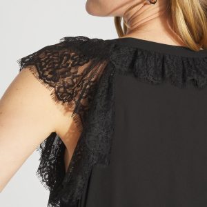 Feminine lace trims the flutter sleeves and the center front of this crepe fabric shell. The Y-neck has a tie-string which you can style as you choose. Wear under a blazer or on its own.